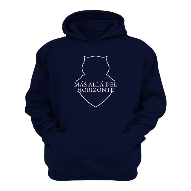 Poleron U. de Chile "MÁS ALLÁ DEL HORIZONTE". Modelo canguro con capucha. Azul Marino.