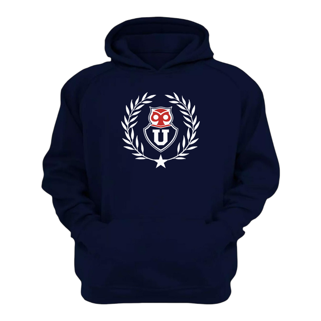 Poleron U. de Chile "Olimpo Azul”. Modelo canguro con capucha. Azul Marino.